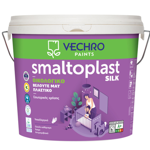 To Smaltoplast Silk είναι πιστοποιημένο οικολογικό πλαστικό χρώμα, άοσμο, εσωτερικής χρήσης με βελουτέ ματ φινίρισμα κατάλληλο για τοίχους, ταβάνια, γυψοσανίδες, σοβάδες, γυψοσοβάδες κλπ. Διαθέτει πολύ ισχυρή αντίσταση στην απορροφητικότητα λεκέδων. Λερώνεται δύσκολα και καθαρίζει πολύ εύκολα εξασφαλίζοντας πιο καθαρές επιφάνειες.